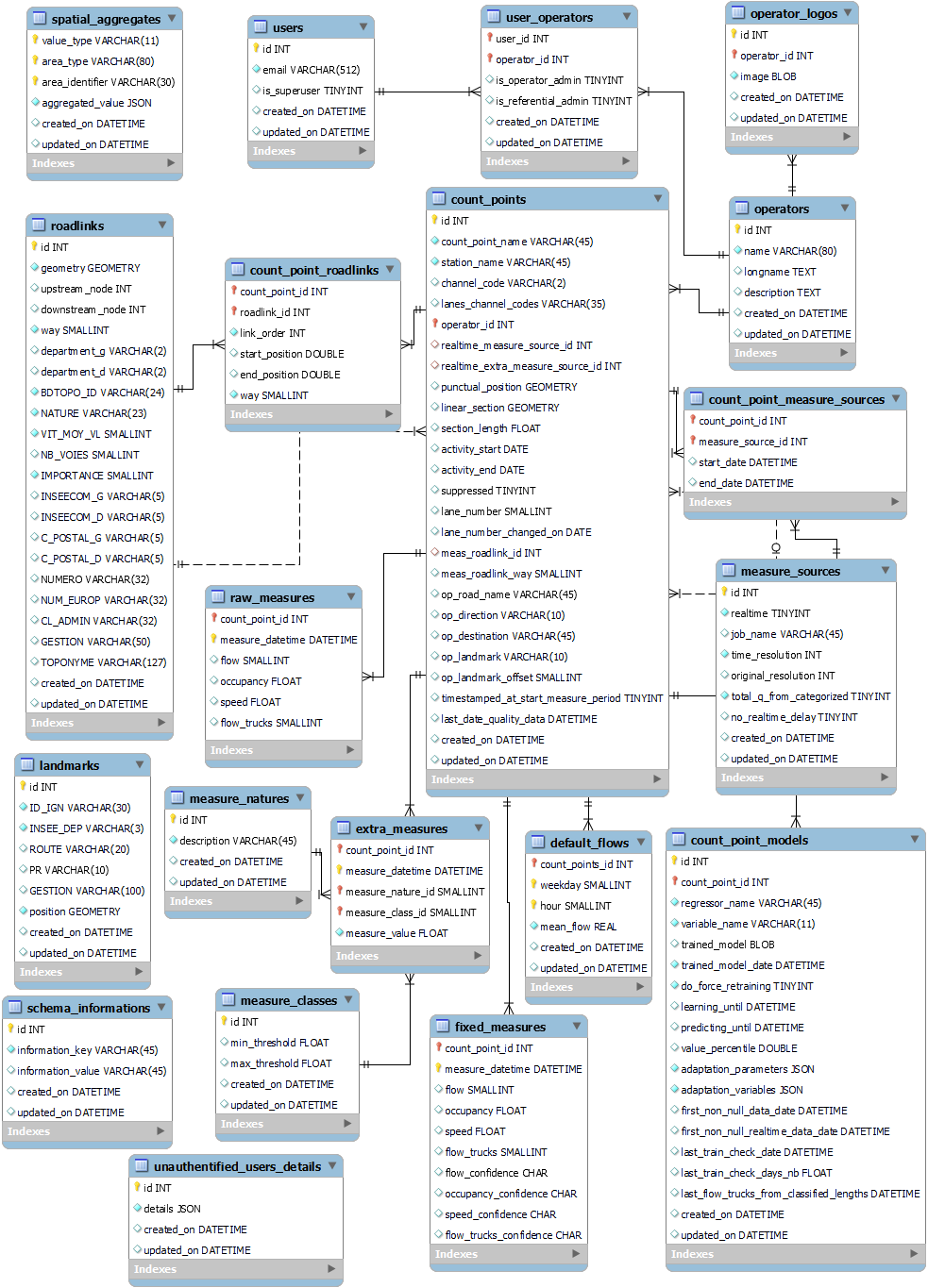 Des tables d’association (La table count_point_roadlinks, La table “count_point_measure_sources”), dont la clé primaire est constituée de la paire des deux clés étrangères définissant la relation,